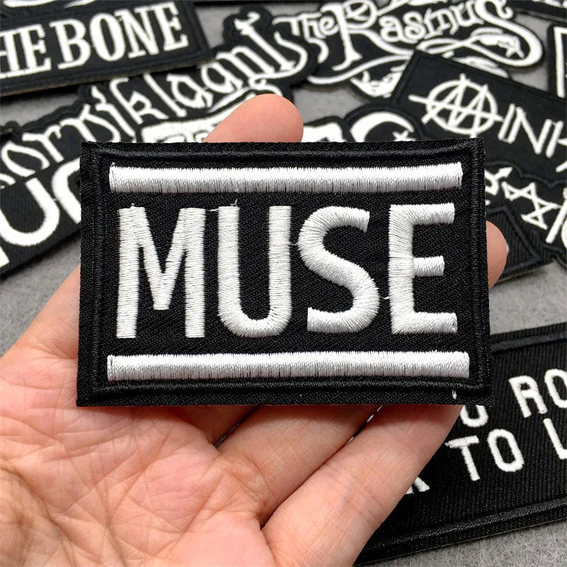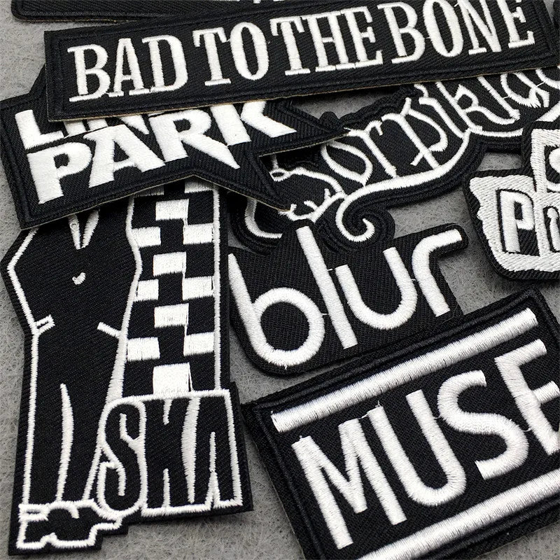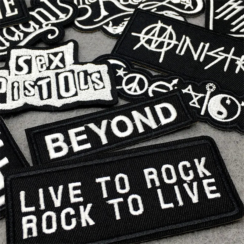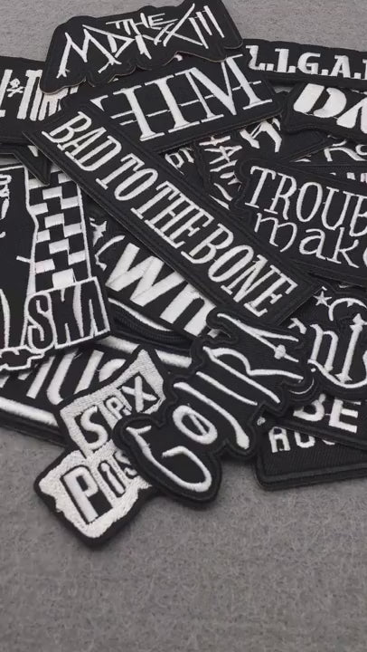 Unleash your inner rocker with a mixed pack of 25 black & white embroidered band-style patches. Every design is unique (no duplicates) and sized for easy placement on jackets, denim vests, backpacks, caps and totes.