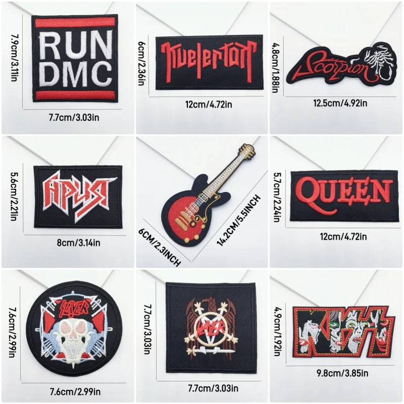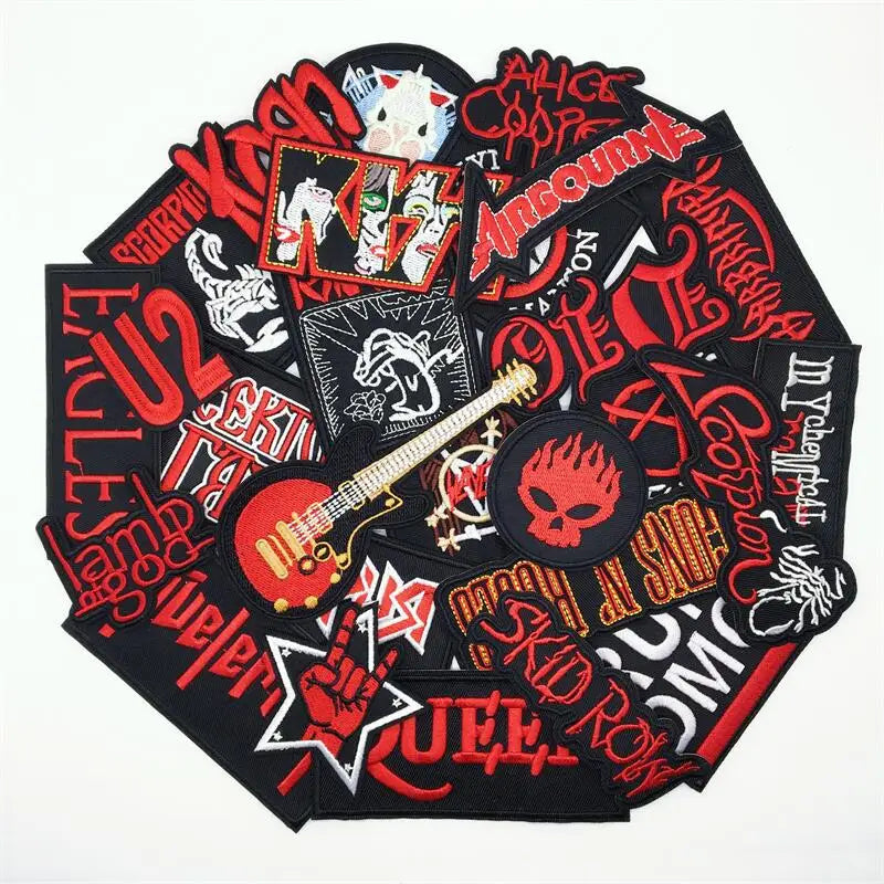 Amplify your style with a 27-piece mix of band-inspired embroidery—guitars, flames, skulls, lightning and rebellious slogans. Perfect for customizing denim jackets, vests, backpacks, jeans, hats and more.