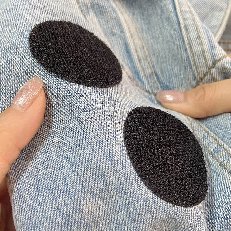 Black Velcro patches applied to a denim fabric, held by a hand.