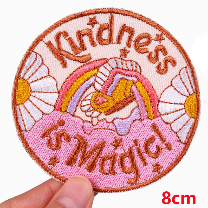Circular patch with cartoon cats and text 'I love all the cats in the world' held by a hand.