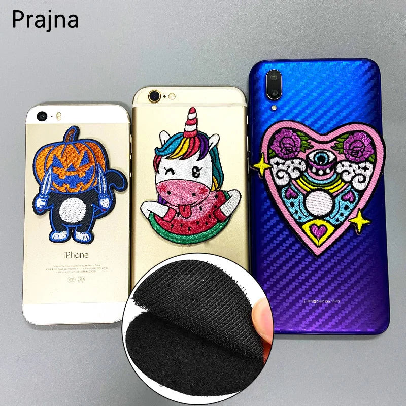 Three phone cases with colorful patches designs on a gray background, including a close-up of a velcro patch.