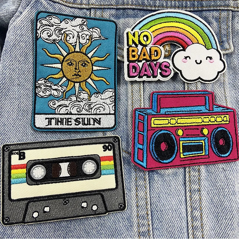 Showing how to apply Black Velcro patches held over a denim jacket with colorful patches.