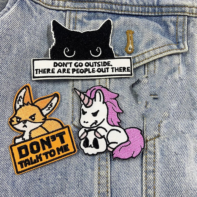Three patches on a denim jacket: a black cat, a fox, and a unicorn with text.