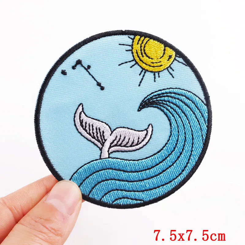 Circular embroidered patch with whale tail, sun, and stars held by a hand on a white background.
