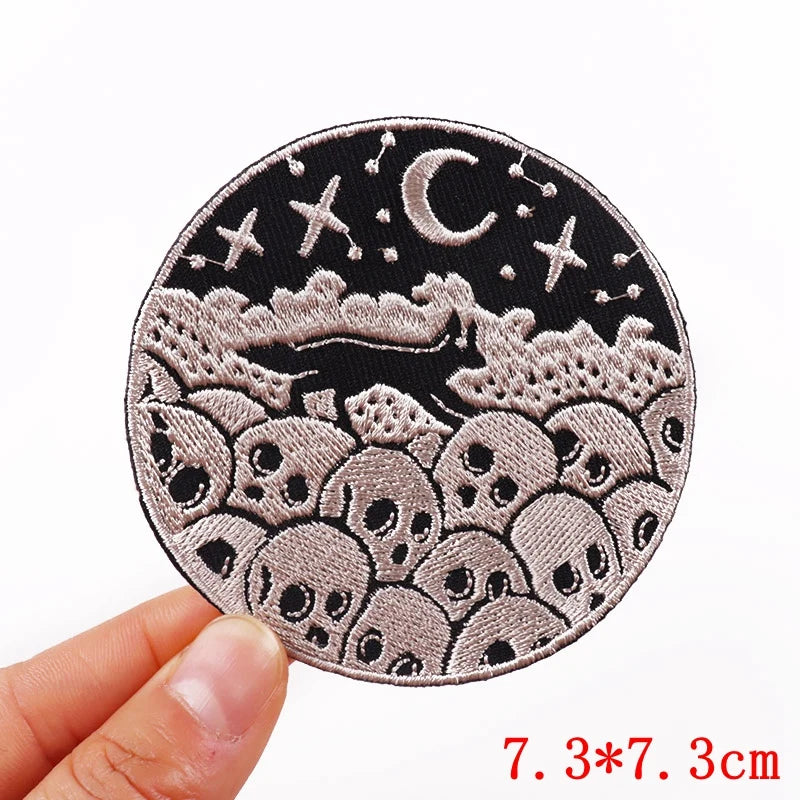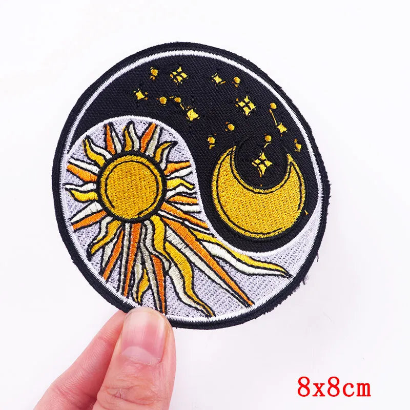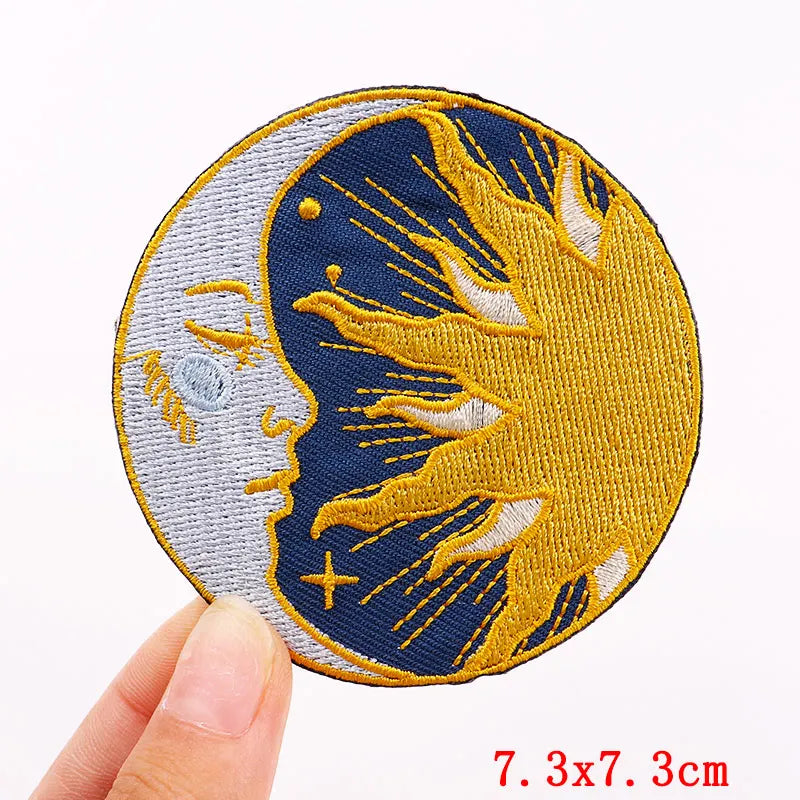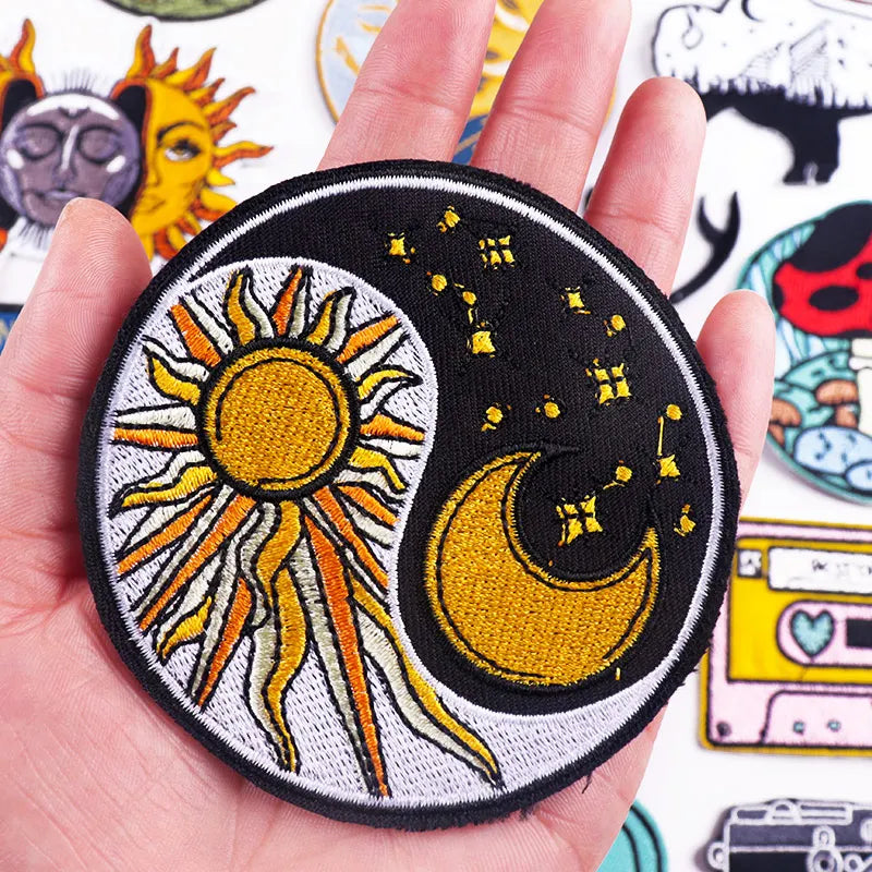 Patch with sun and moon design held in a hand, surrounded by other patches.