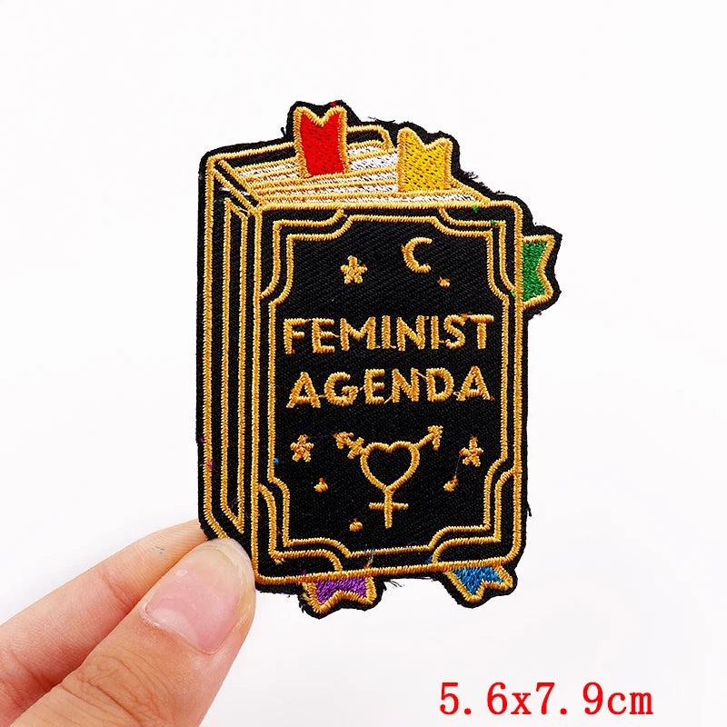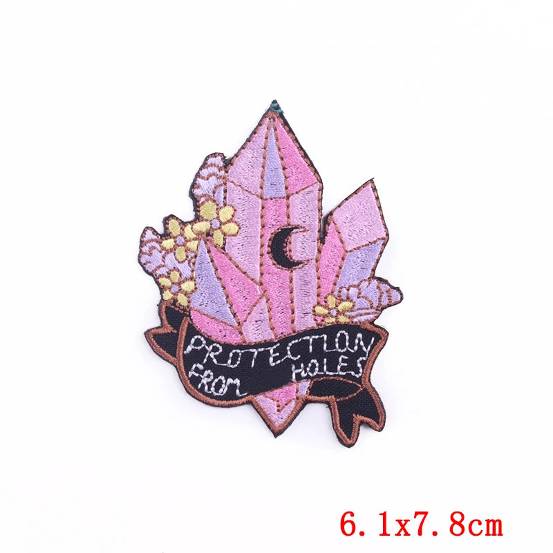 Circular embroidered patch with pink and white design held by a hand, on a white background.
