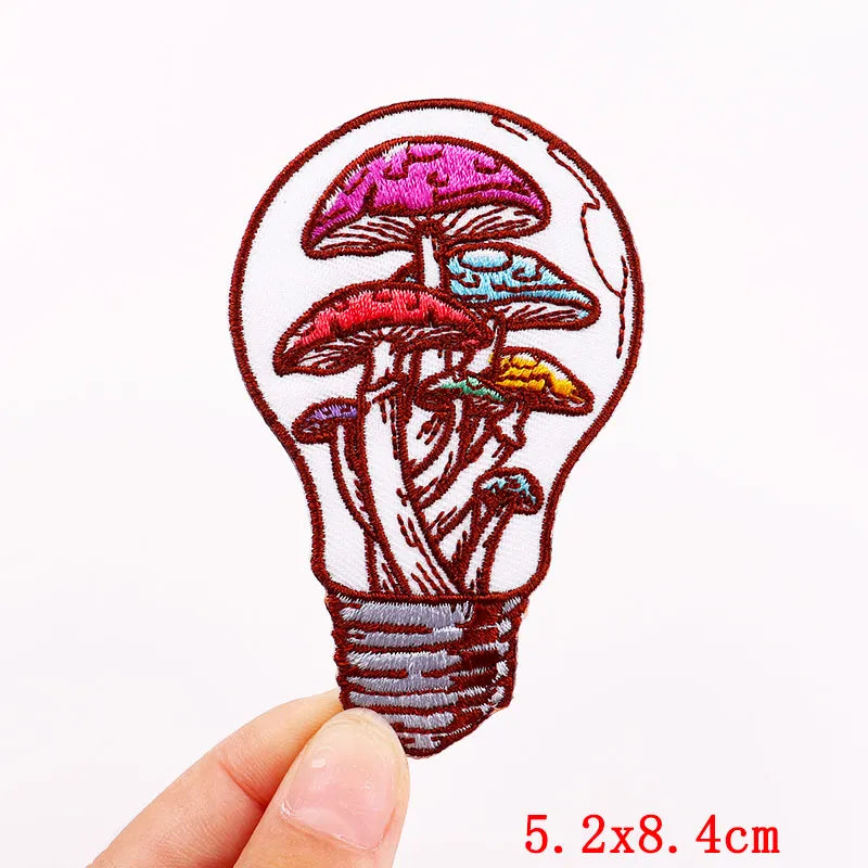 Embroidered patch of mushrooms inside a light bulb held by a hand on a white background.