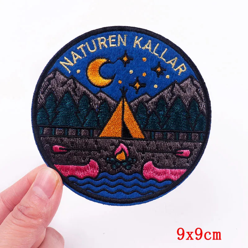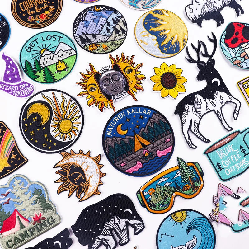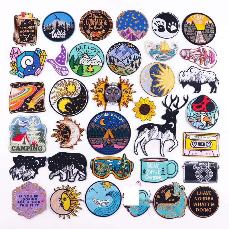 Outdoor iron-on patches with sun, moon, camping, mountains, forest, and nature adventure themes