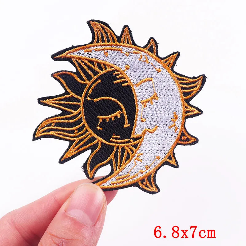 Embroidered patch of a sun and moon design held by a hand, with size &