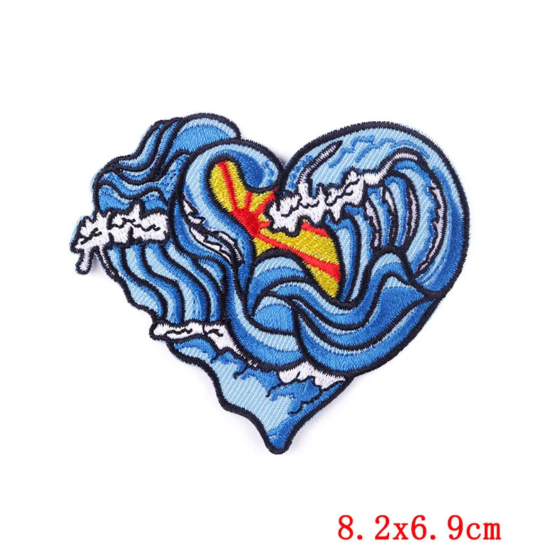 Heart-shaped yin yang patch held by a hand with dimensions &
