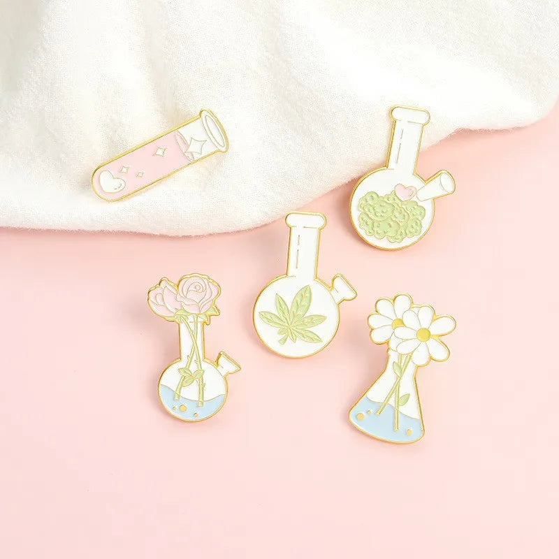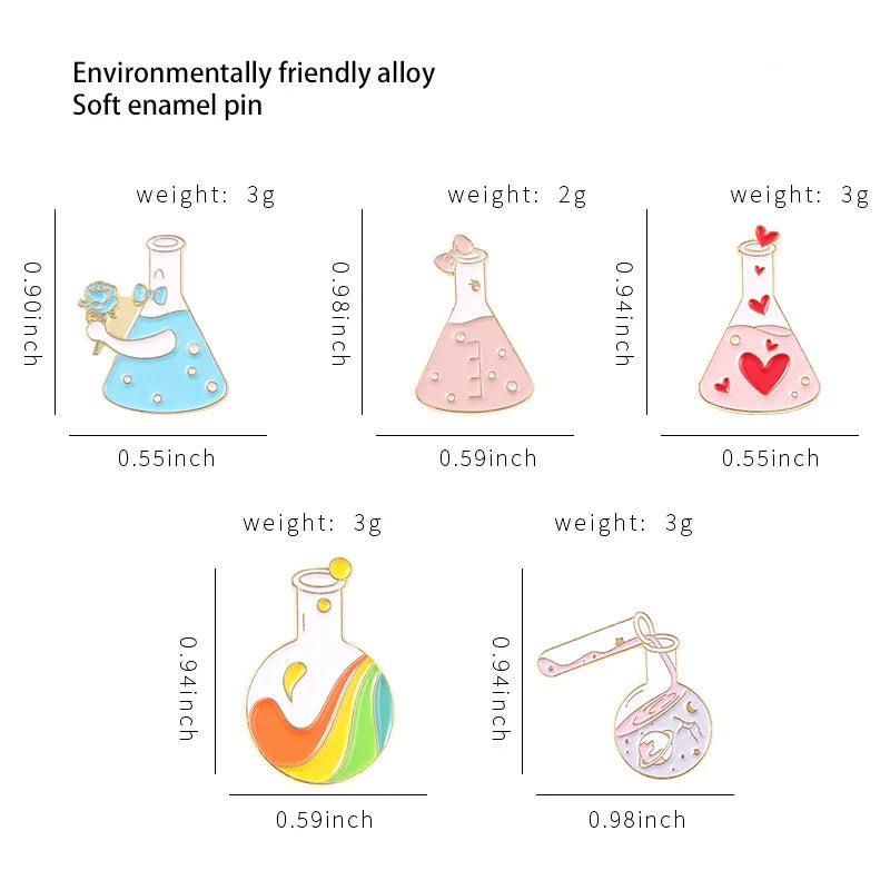 Colorful science-themed enamel pin pack featuring beakers, test tubes, flasks, and microscopes in random assortment๐Ÿงช Product Highlights