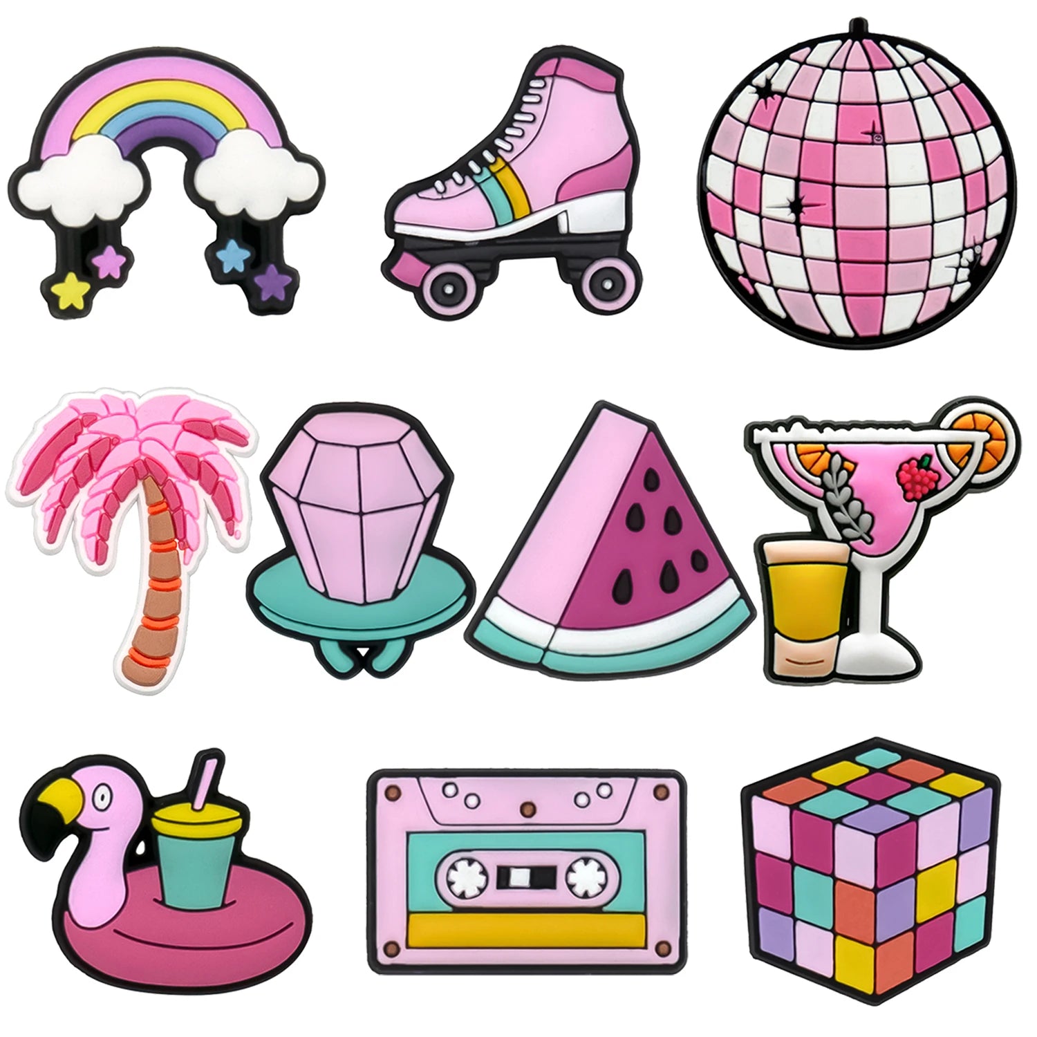 Add playful personality to clogs, Crocsβ„’, sandals, tote bags and wristbands. Each curated 10-piece set pops with color and a clear themeβ€”easy to attach, waterproof and reusable.