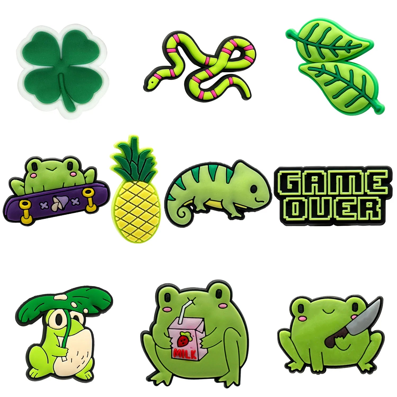 Collection of green cartoon-style shoe charms with various designs on a white background